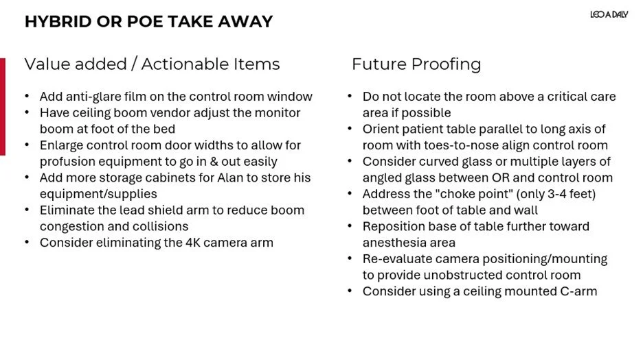 Panelists who participated in the POE presentation shared targeted recommendations for teams designing hybrid operating suites within active hospitals. Their insights centered on pre-planning, flexibility of the space and collaboration throughout the life of the project.