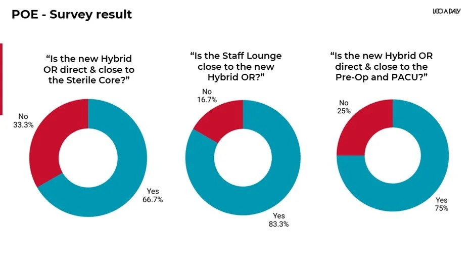 Staff feedback showed strong performance in several operational areas. Most respondents reported that the hybrid OR is well connected to the sterile core, staff lounge, pre-op and PACU. Circulation around surgical lights and booms scored high, and room pressure was consistently maintained.