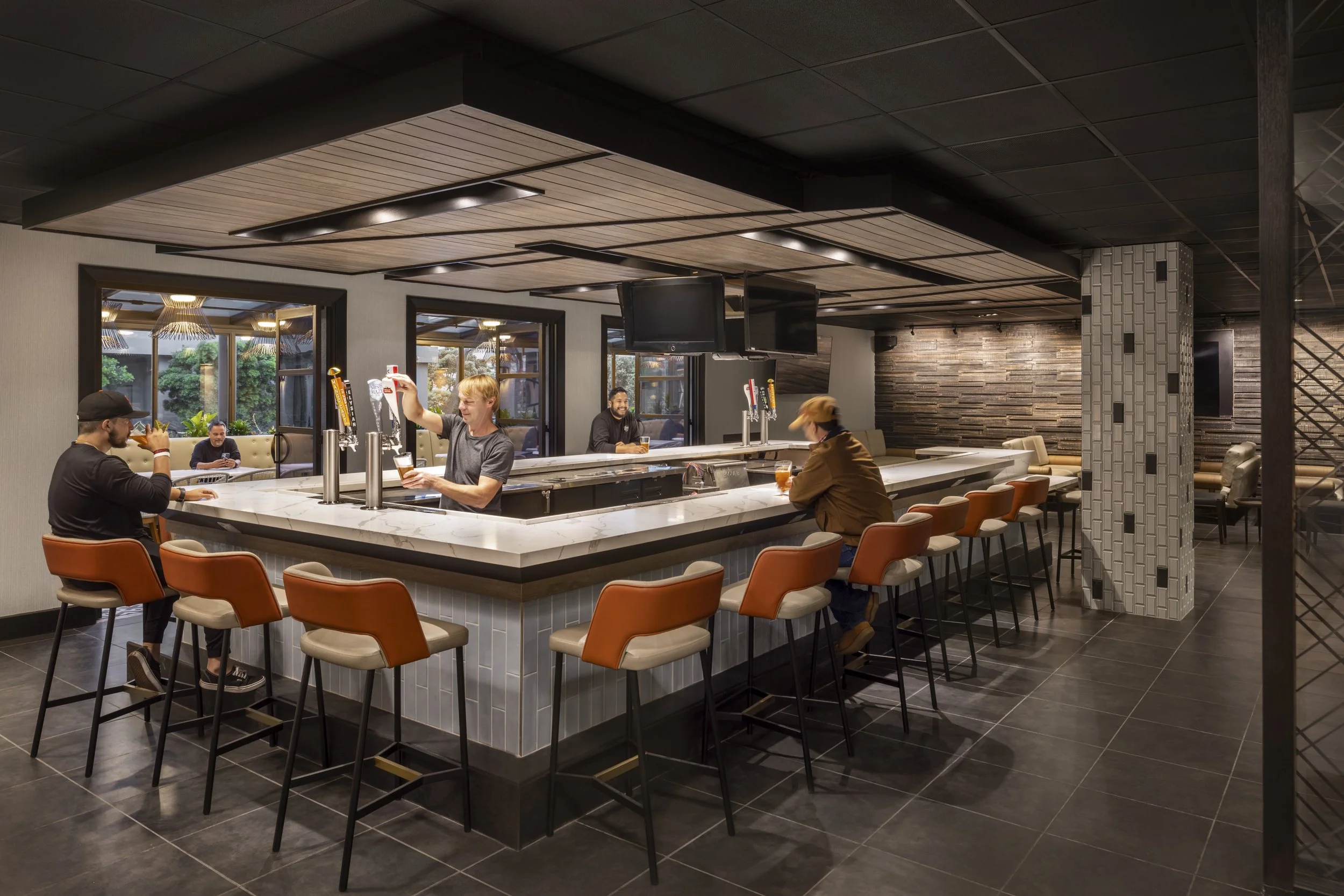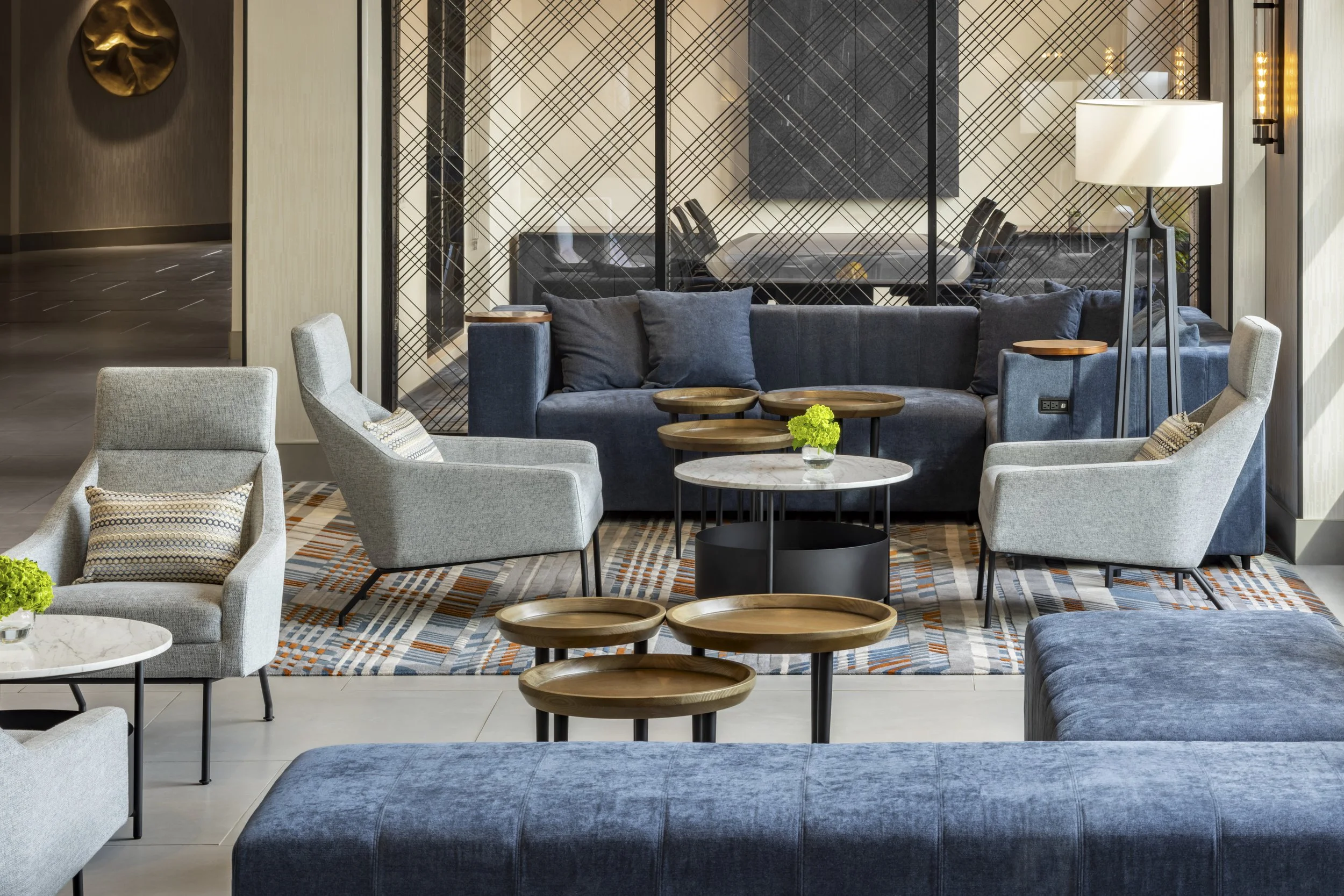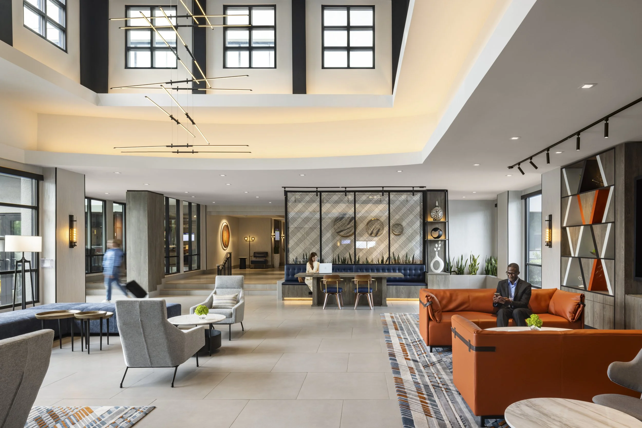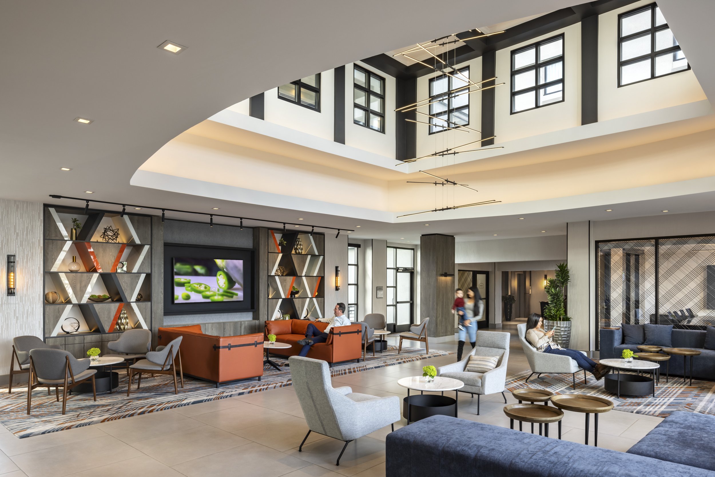The design implements conversational elements throughout the lobby that cater to small group gatherings and create special moments curated for social media. These areas are highlighted by unique light fixtures, accessories and art. The transformed reception area welcomes guests with uniquely shaped reception desks, which create a focal element in the space. The open atrium provides options for guests to use a workshare bench with numerous outlets or relax and enjoy the entertainment area, which features a media wall. The lounge bookshelf, with diagonal lines and pops of color, reflects the Bay Bridge at sunset. In the restaurant, the same color palette is carried through to create a serene sense of flow. New furniture, banquettes and re-finished bar countertops elevate the restaurant with an upscale, modern look, and a new terrace with a green wall feature provides an elevated space for guest meals and can also accommodate private events.