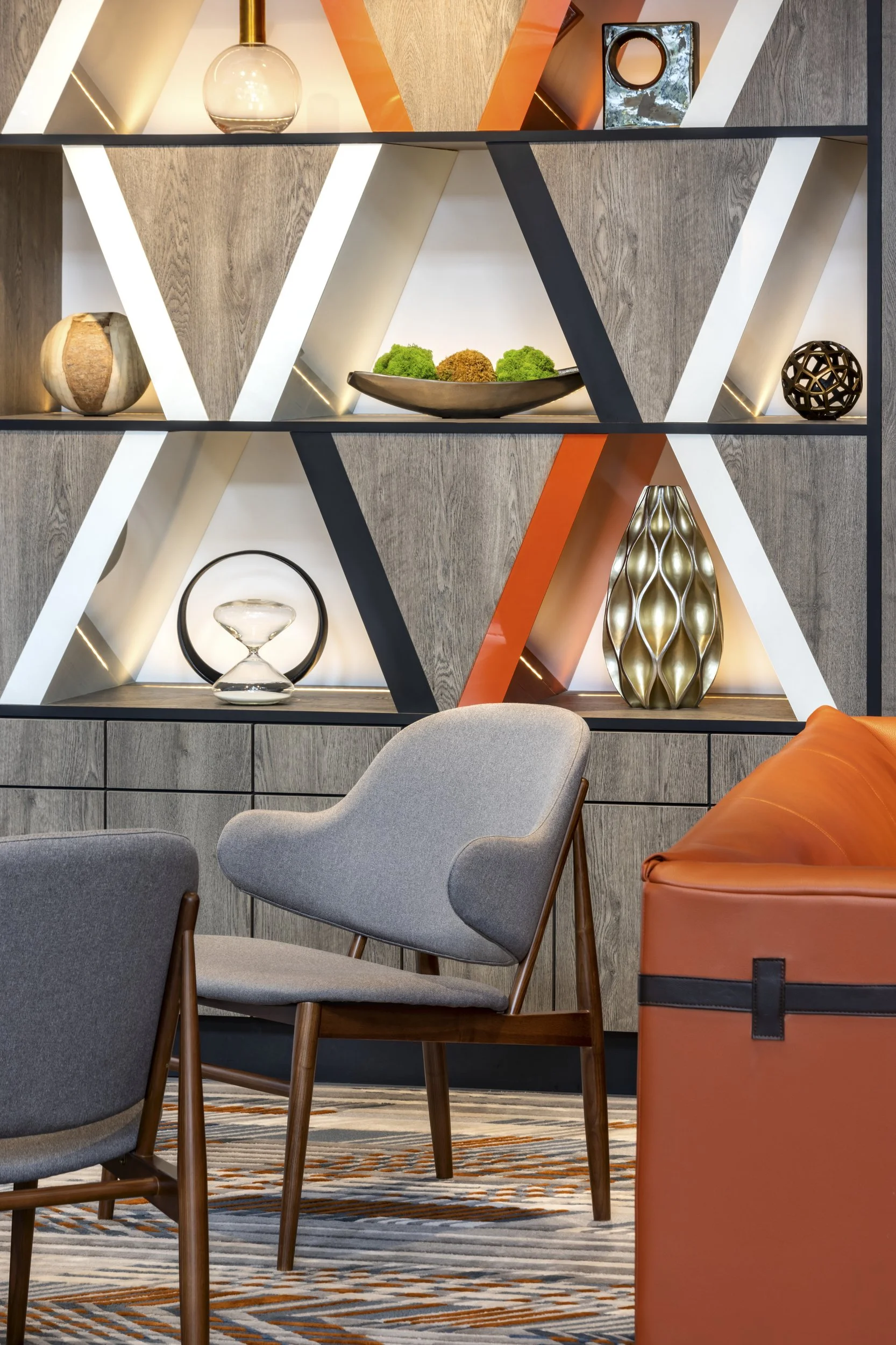 Drawing inspiration from various architectural and cityscape elements of San Francisco, the interior design creates bold statements, effusing a tailored and handsome, yet casual and cool style. Design elements deliver edgy character and a boutique personality, while engaging and modernizing the visual spaces. Angles and lines reminiscent of the Bay Bridge are applied throughout these spaces. Steel blues and greys of the cityscape lay the foundation for the color palette, while punches of vibrant sunset orange pierce through the mood.